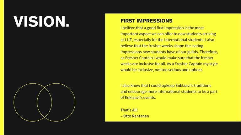 Jos sinulla on minkäänlaisia kysymyksiä, älä epäröi ottaa yhteyttä osoitteeseen fuksivastaava@enklaavi.fi tai suoraan Telegrammissa Juho Vahteriin @juhovee tai Einojuhani Kostiaiseen @einojuu.